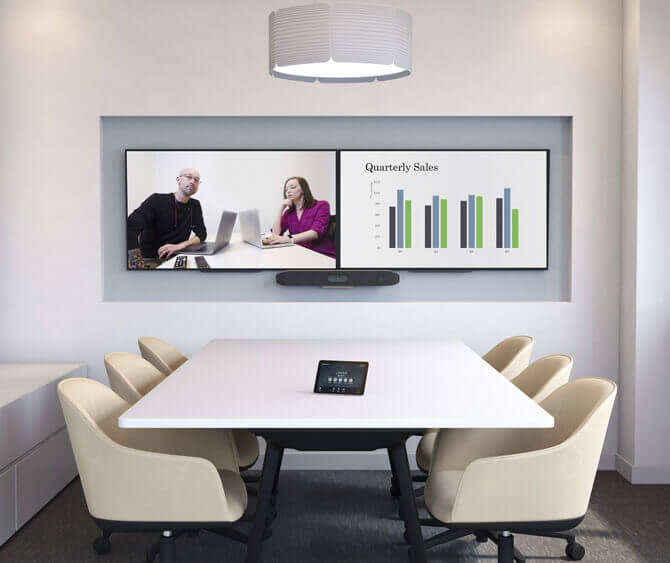 The Poly Studio X50 video bar delivers radical simplicity in a small, elegant package. In small- and medium-sized rooms, connect easily with whatever video collaboration software you may use. Experience full boardroom-quality audio, advanced camera capabilities, and quick wireless content—all in one sleek video bar. And say goodbye to unnecessary pucks, cords, and cables, along with the PC or Mac to drive the meeting, since the Poly Video OS runs the show. Easy to install, easy to manage.